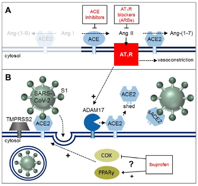 Şekil. Anjiotensin (AT)-dönüştürücü enzim-2 (ACE2) AT-I’i AT-(1-9)’a, AT-II’yi ise AT-(1-7)’ye dönüştürür (Panel A).  ACE inhibitörleri (ACEI) ortamda var ise AT-I’in AT-II’ye dönüşümü engellenir (Panel B). ACE2 aynı zamanda SARS-Cov-2’ye de “serine protease transmembrane protease, serine 2” (TMPRSS2) ile işlem gördükten sonra bağlanır. Disintegrin ve metalloproteaz 17 (ADAM17) ile membrana bağlı ACE2 parçalanırsa solubl (s) ACE2 ortaya çıkar ve bunlar SARS-Cov-2 girişini sağlayamaz, virüsü solüsyon içinde tutarlar. AT-II tip 1 reseptörleri (AT1R) ile, ADAM17 etkinliğini artırırlar, ve AT1R blokerler (ARB) bunu önler. Ibuprofen ACE2’yi artırır, olasılıkla bunun mekanizması da siklooksigenaz (COX) inhibisyonu ve Peroxisome Proliferator-Activated Receptor gamma (PPAR-γ) aktivasyonudur.